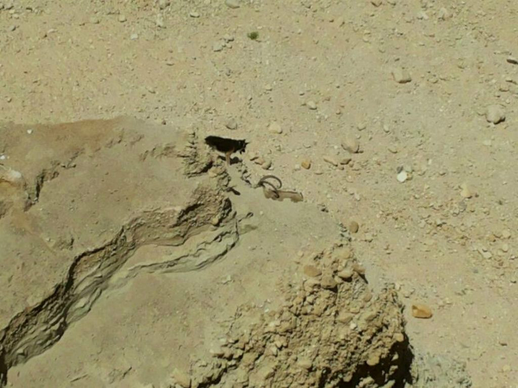 אלא שאז הביט סביב והבין שהוא בבעיה: הוא ניצב על מצוק צר מאוד, תלול מאוד, ולהתחיל כאן בתרגילי תקיפה נראה לפתע רעיון לא מי יודע מה, לא בטוח, קצת מפחיד. בלבו היו אפילו הרהורי נסיגה, עם או בלי טקטיקה, אבל הרהורים לחוד ומימוש לחוד: אין לו איך לסגת. הוא לא קל רגליים כיעל ואינו יכול לדלג מעלה לחומת הטיילת. מאידך – גם לרדת לכיוון הוואדי אינו יכול, הן מפאת גובהן ותלילותן של מדרגות המצוק, והן משום שעל המדרגה מתחתיו ניצב היעל זקור קרניים ואזניים, נחיריו מורחבות והוא משמיע המיית "שלא תעז אפילו לחשוב על זה"...