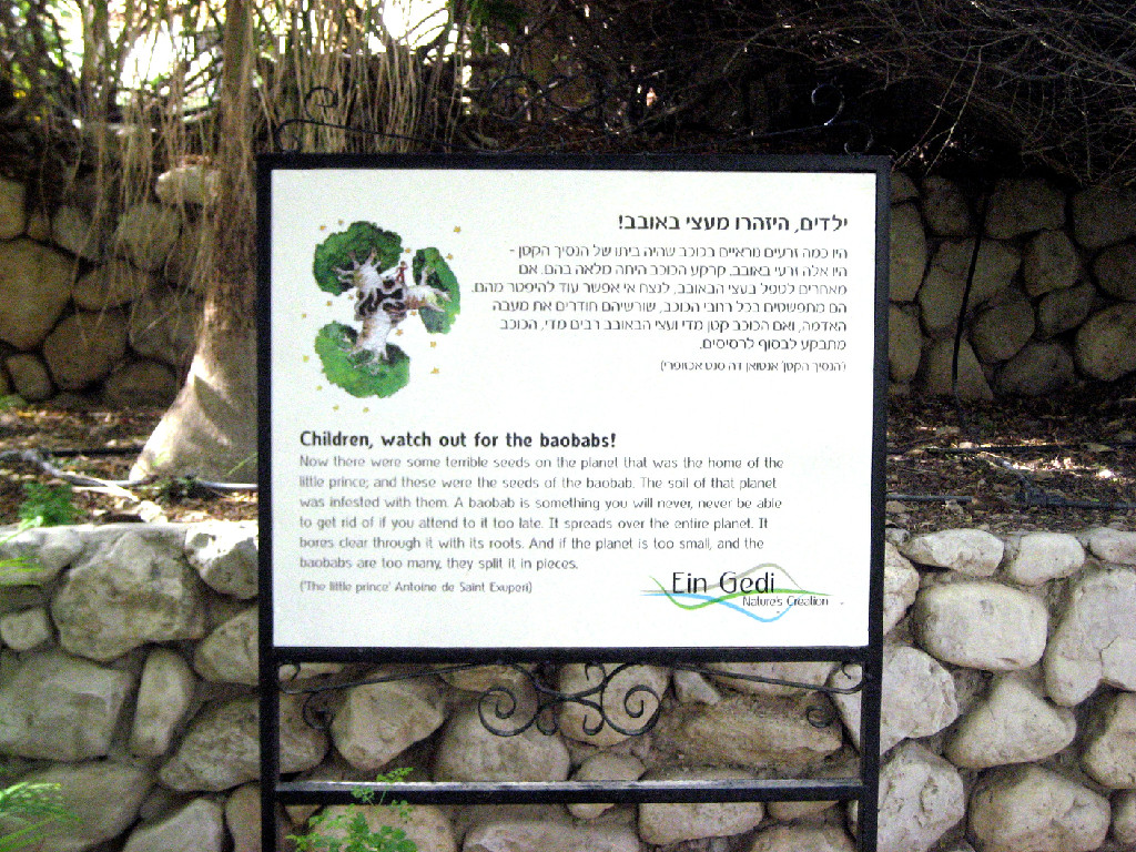 השלטים ניצבים מסביב למדשאה הגדולה, ליד עצי הבאובב, התמר הפיקוס והזית.