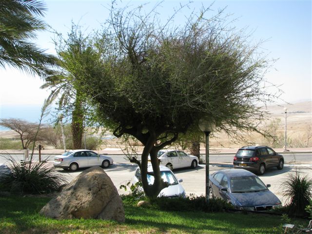 מור אפריקאי - COMMIPHORA ABYSSINICA עץ טרופי, מאזורים יובשניים במדבר אוגדן באתיופיה. העץ בעל שרף ריחני. בגן הנוי שלנו אוקלמו שני שתילי מור בהצלחה רבה. הם הובאו ע"י פרופ' יהודה פליקס, שהיה בוטנאי וחוקר התנ"ך, וחקר את הצמחים המוזכרים במקורות הקדומים. שני השתילים שהוא הביא של המור האפריקאי ממדבר אוגדן באתיופיה, נשתלו בגן הנוי שלנו, בשנת 1973. וכך הוא כתב: "ניסוי שערכנו בגידול עץ המור בעין-גדי לימדנו כי העץ מתפתח במהירות מפתיעה – עובדה שהוכיחה כי בבקעת ים-המלח שוררים תנאים אידיאליים לצמחים ממשפחת הבושמיים, שהמור והלבונה משתייכים אליה". העצים נותנים פירות כדוריים, וציפורים בגן אוכלות את הפרי ומפיצות את הזרעים. הנביטה שלהם ניכרת ברחבי הגן. היום חלק מעצי המור האפריקאי בגן התפתחו מהנביטות האלה. עצים אלו נהנים מאקלים חם, ודרישתם למים מועטה. לכן אנו רואים בכך יתרון גדול בהשארתם בגן. כופר לבן - LAWSONIA INERMIS - HENNA מוצאו: צפון אפריקה, הודו ואוסטרליה. מעליו מכינים את החינה. כמה שיחים של כופר לבן נשתלו וצומחים בערוגות הבושם בגן הבוטני. גם הם נמצאים בשיא תפארתם בעונת הקיץ החם, יש להם כעת אשכולות פרחים ואשכולות של כדורים נושאי זרעים. והכי הכי בולט הוא הריח שהם מפיצים למרחוק. אז כפי שנאמר בשיר השירים: "אשכול הכופר, דודי לי בכרמי עין-גדי", המרמז על חגיגות ט"ו באב, חג בו היו יוצאים לתנות אהבים בכרמים הבשומים בעין-גדי .