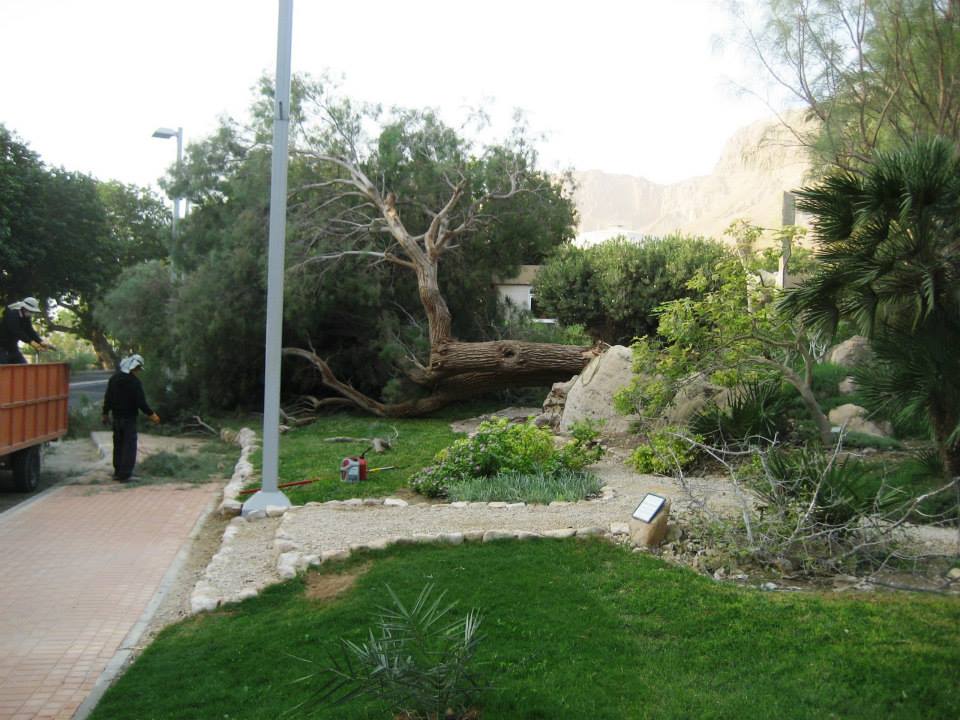 עובדי הגן כבר עסוקים בניסור ובהרחקת הענק שנפל. נחמה פורתא - עץ המורינגה היפה שעמד מאחוריו יקבל מעתה יותר שמש ויותר חשיפה לעין המבקרים.
