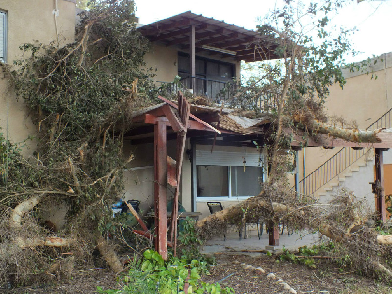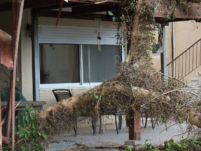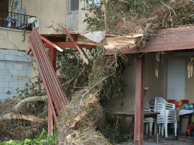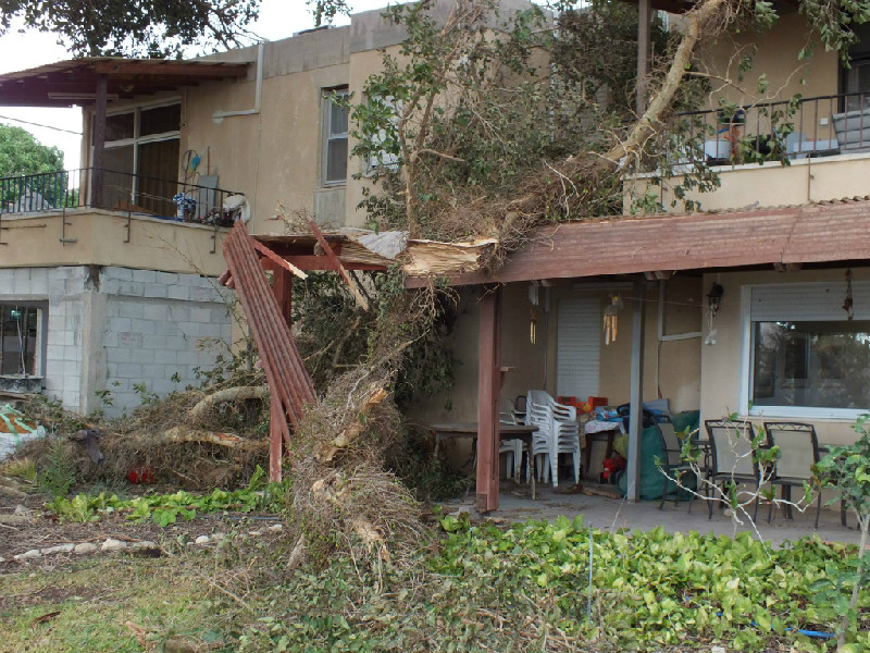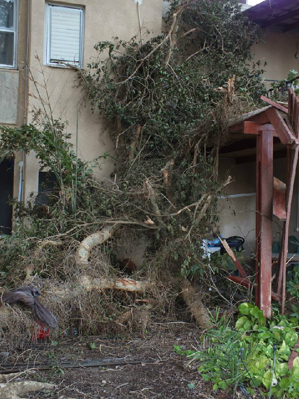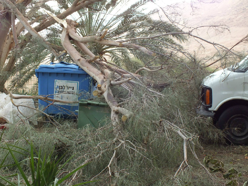 והיופי הזה מלווה גם - כרגיל - בנזקים: הסובלים העיקריים הם עצי הגן שחלקם לא עומד ברוח העזה ורוקס ונשבר, פה ושם נפגעו גם פרגולות וסככות, והקיבוץ שבימים רגילים מסודר ונקי נראה כמו אחרי פוגרום-טבע.