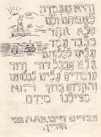 ההגדה נכתבה וצוירה ע"י הילדים והיא מוקדשת כשי לפסח לחיילנו במקומותיהם, בתקוה ובתפילה, שיהיה זה השי האחרון וכי בקרוב יהיו יחד אתנו בבית עם הניצחון וגאולת ישראל השלמה בארצו.