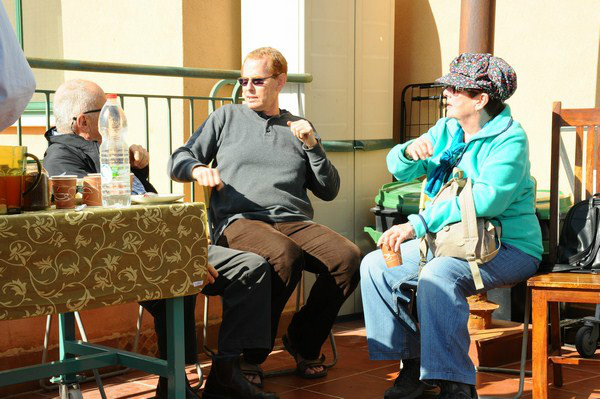 משם נסענו לרותי ושייקה להרדוף שביתם בנוי מעל ביתו של עומר שגם קיבל את פנינו. המפגש איתם היה מרגש לכולנו. ביתם יפה ומואר, פתוח לנוף המרהיב. סיפורים, שיחות קטנות עם כל אדם, כיבוד טעים.... אנחנו הבאנו להם עציץ ליום הולדתם החל בקרוב עם ברכות שעוד כתבה אריאנה. ישבנו שעה קלה איתם במרפסת ביתם והמשכנו הלאה.